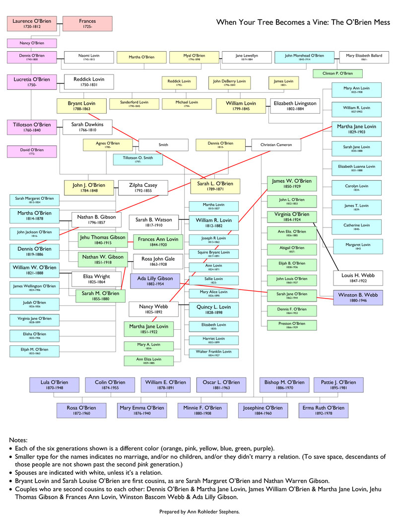 A while back I tried to map out the O’Brien family tree without repeating any names. Rather than the type of tree everyone is used to, I listed Laurence and Frances’s children one on top of each other down the left side of the page and spread the grandchildren out to the right. The fourth generation is listed in three different columns with the fifth generation in columns between them. Most of the sixth generation is at the bottom. Cousin marriages are indicated with a red line. Each generation is a different color to make it a bit easier to follow. However, it’s still a mess.