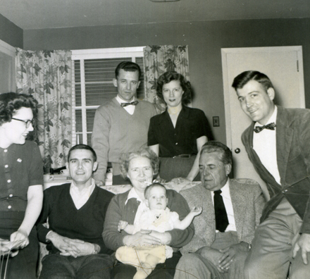 Momma’s family (the McKenzies) sitting on the sofa in the living room. In the background is the dining area and the door to the side yard. Front: Momma, Uncle Benny, MaMa holding me, PaPa, and Daddy. Uncle Mac and Aunt Betty in the back.
