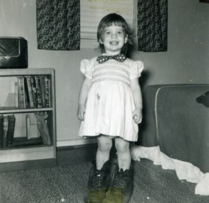 My earliest memory, when I wasn’t quite two years old, takes place in my parents’ bedroom. Daddy thought it would be cute to dress me up in his boots and a bow tie. I remember thinking how silly it was!
