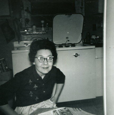 Momma sitting in the doorway between the kitchen and the paneled room. The dishwasher and sink are in the background.